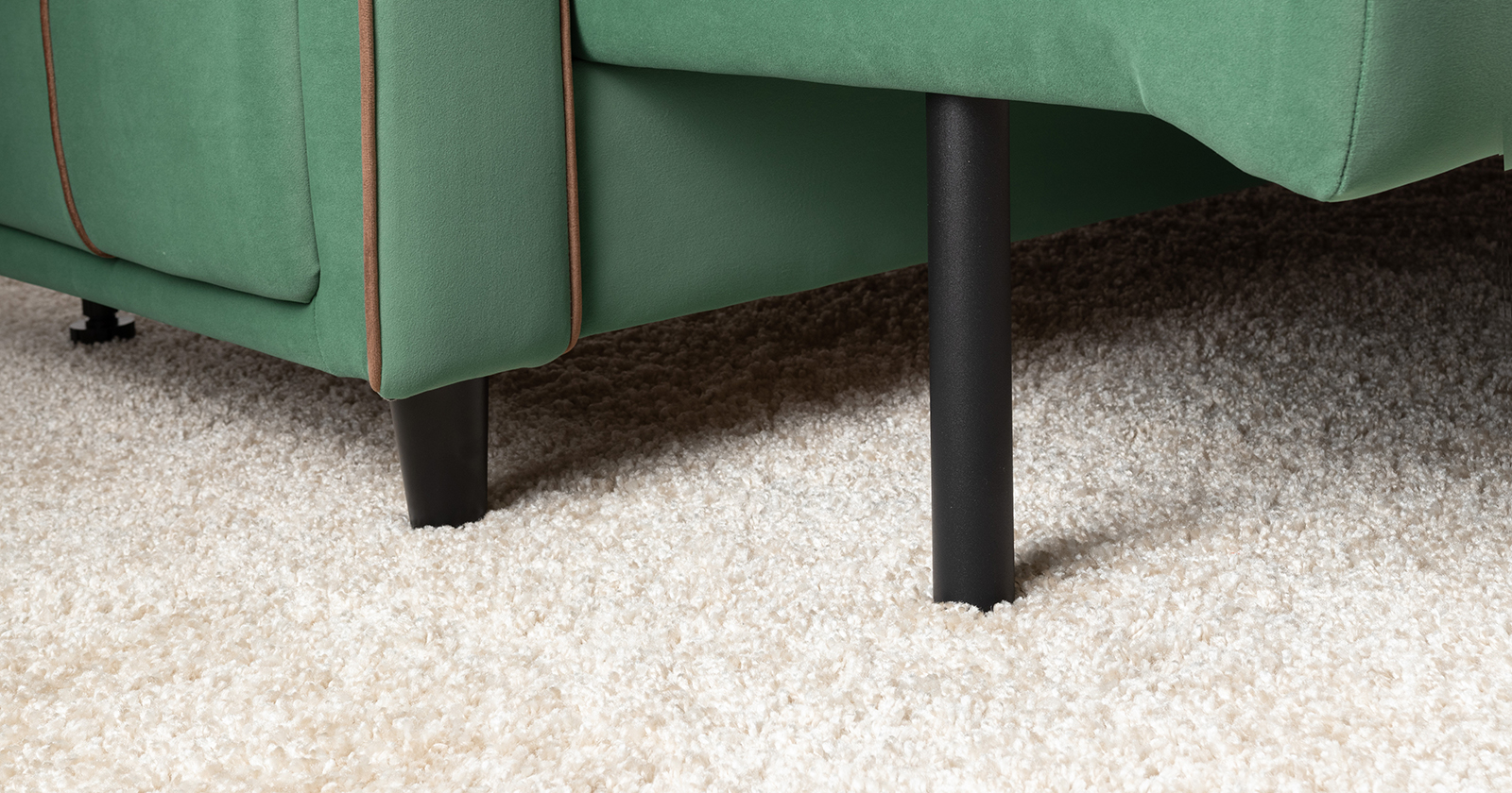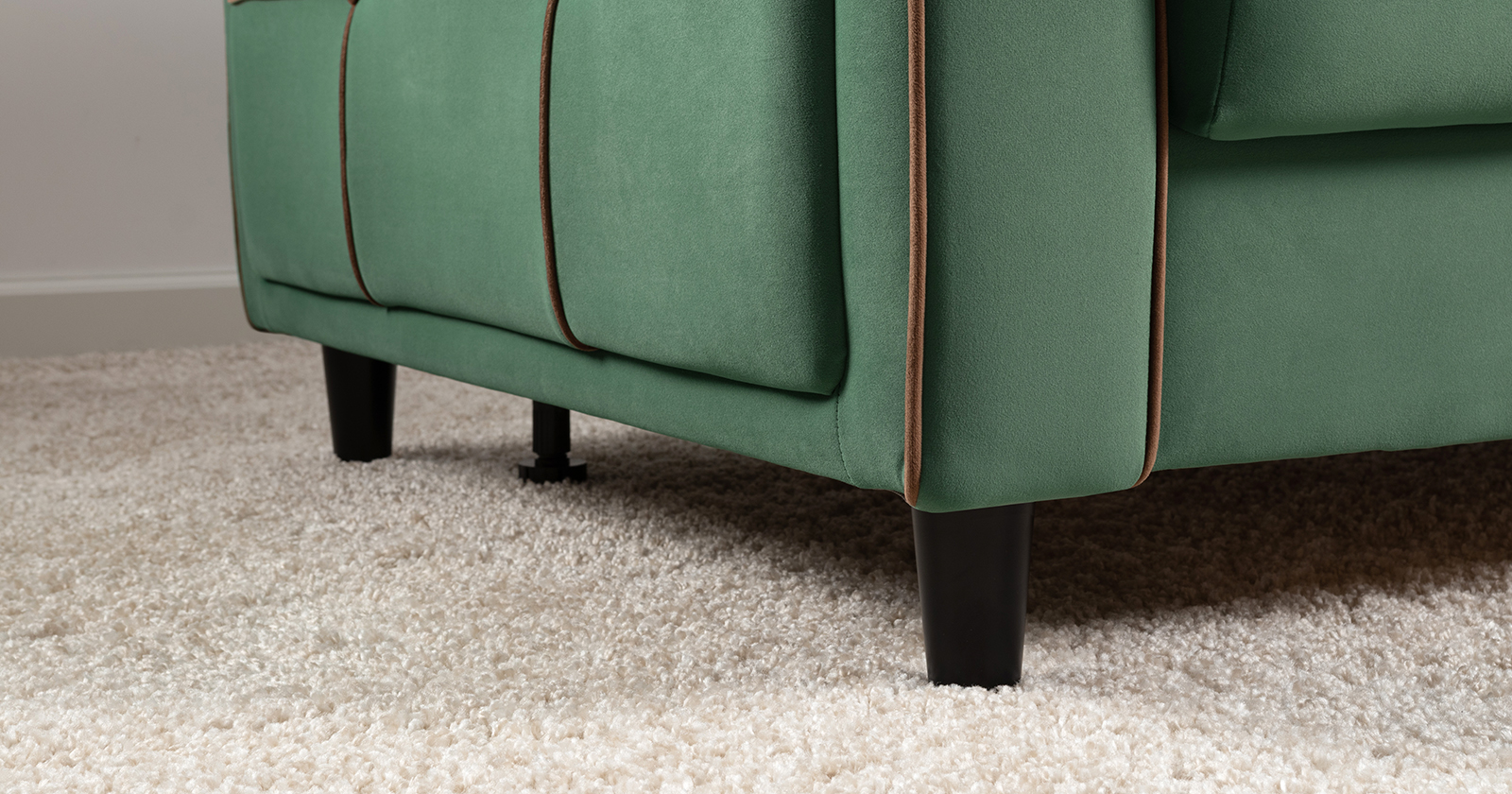 Декоративные канты на подушках и вставке подлокотников. Пуговицы в местах пересечения кантов на подушке и вставке подлокотников. По торцам подлокотников и думках контрастный декоративный кант. Защипы на сиденье и средней большой подушке.