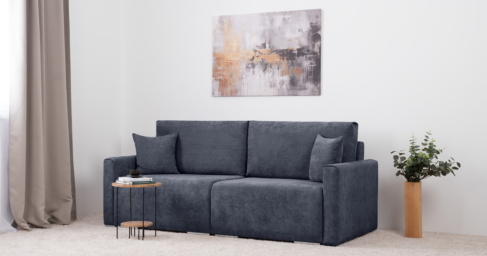 «Компоновка 3» состоит из: двух диванов арт. ТД, двух узких подлокотников арт. ТБ, двух приспинных подушек и двух декоративных подушек.