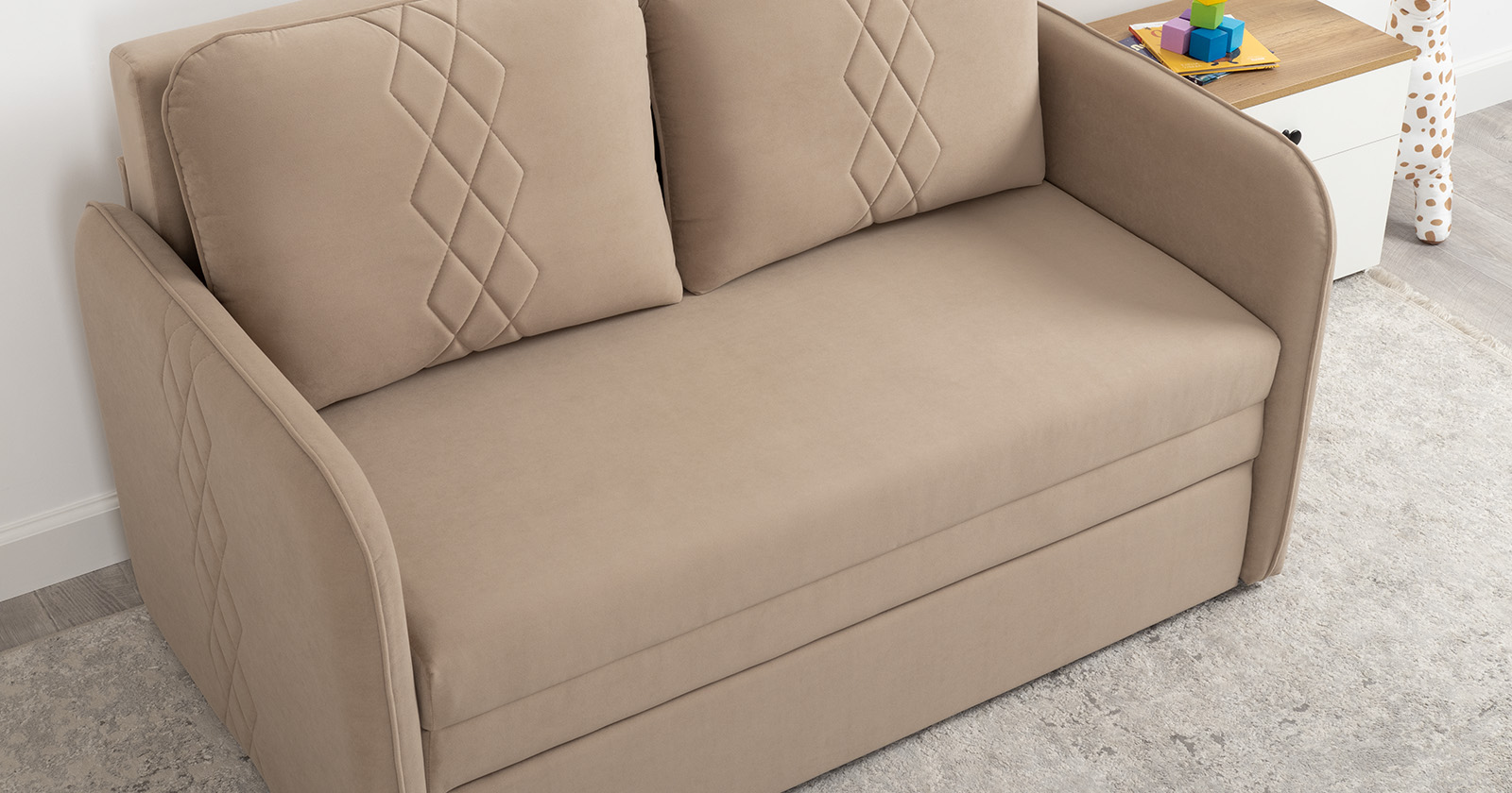 Стильный компактный диван для детской и гостиной. При своих скромных размерах он трансформируется в полноценное спальное место для детей и подростков. Лаконичный дизайн в виде декоративной стежки подчеркивает фактуру велюра, а небольшие размеры позволят разместить его в любом пространстве.