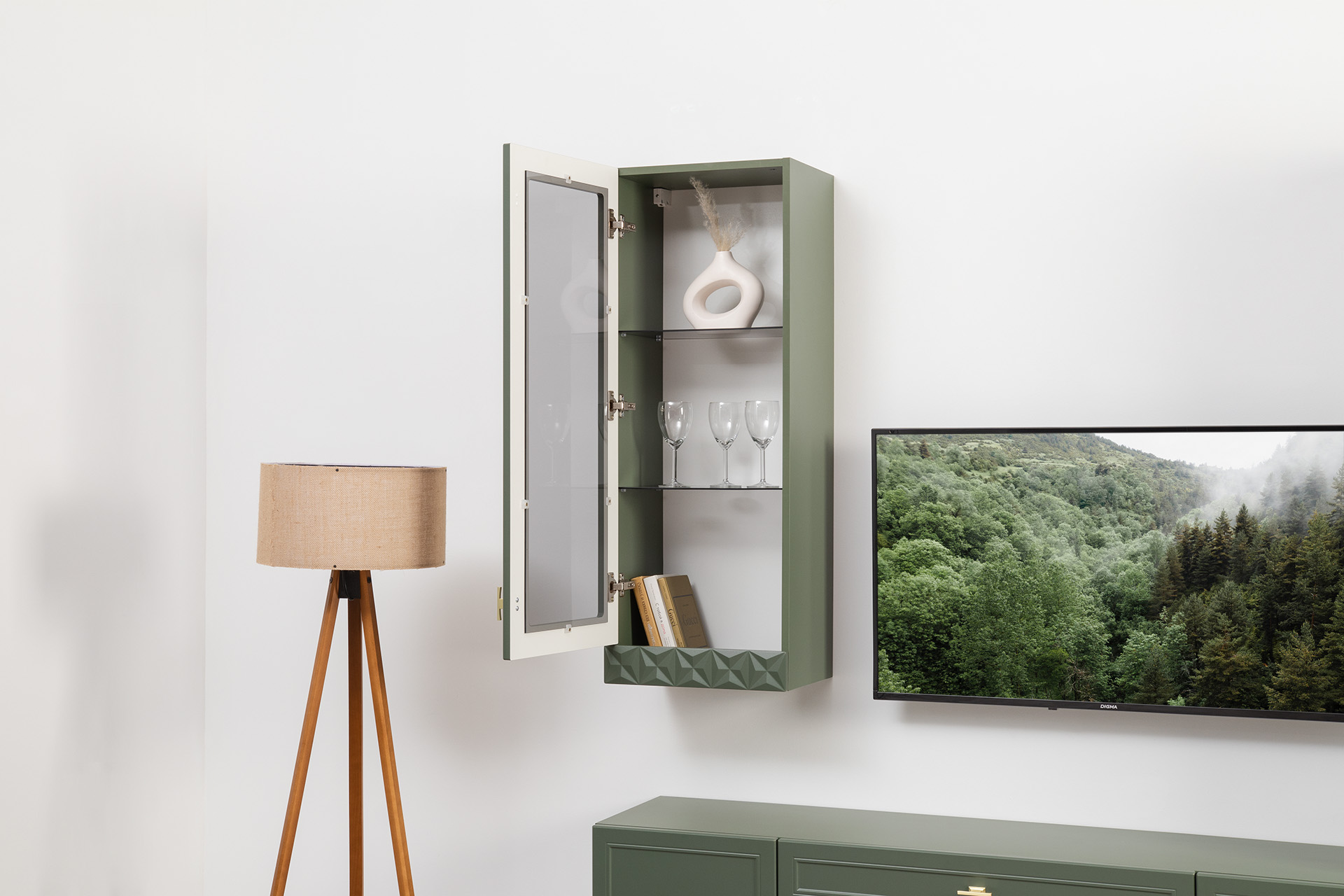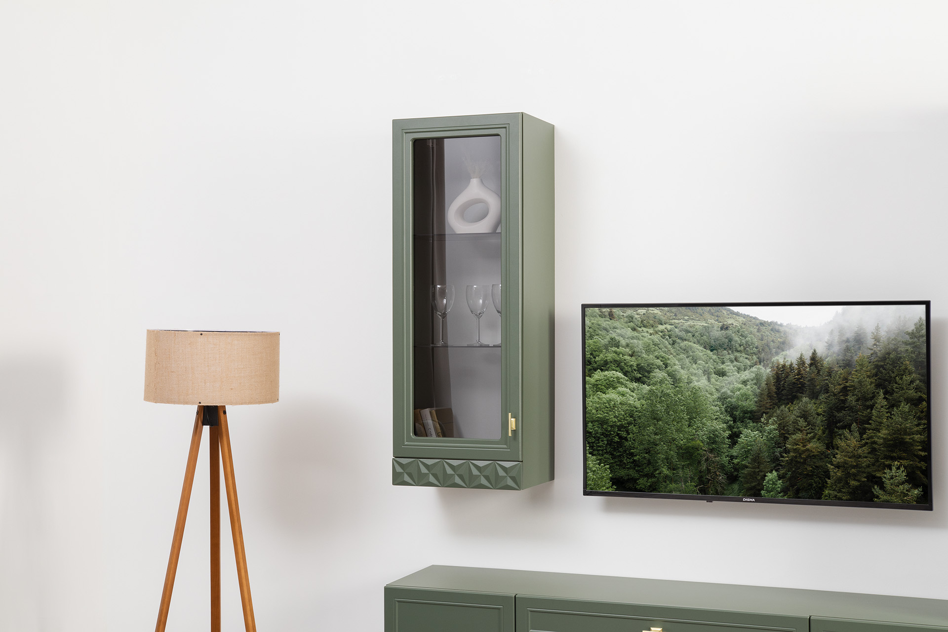 Гостиная Марион композиция 2 дымчатый зеленый K521, олива шагрень AG 1050 ПВХ, белый PE шагрень (собирается на любую сторону)