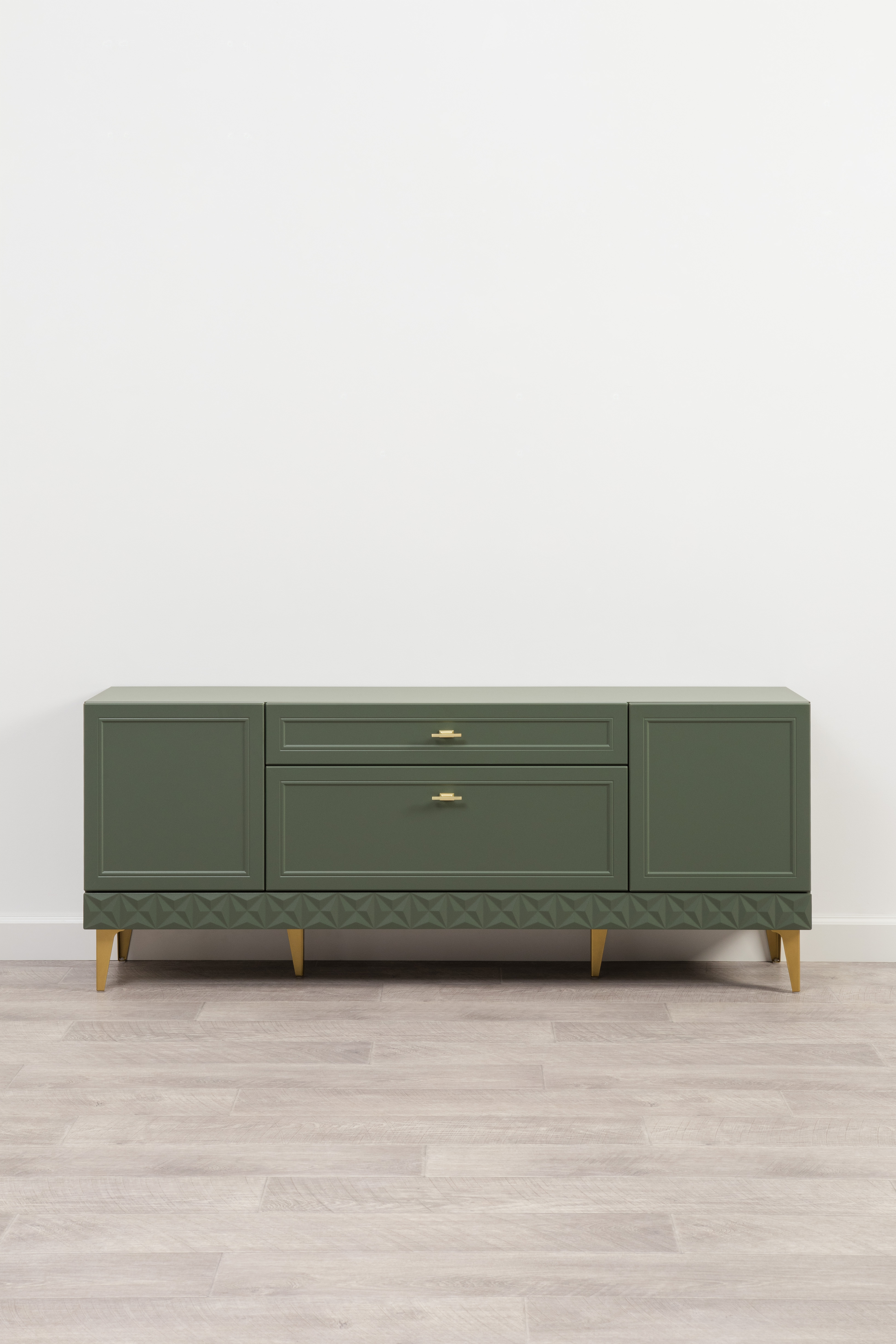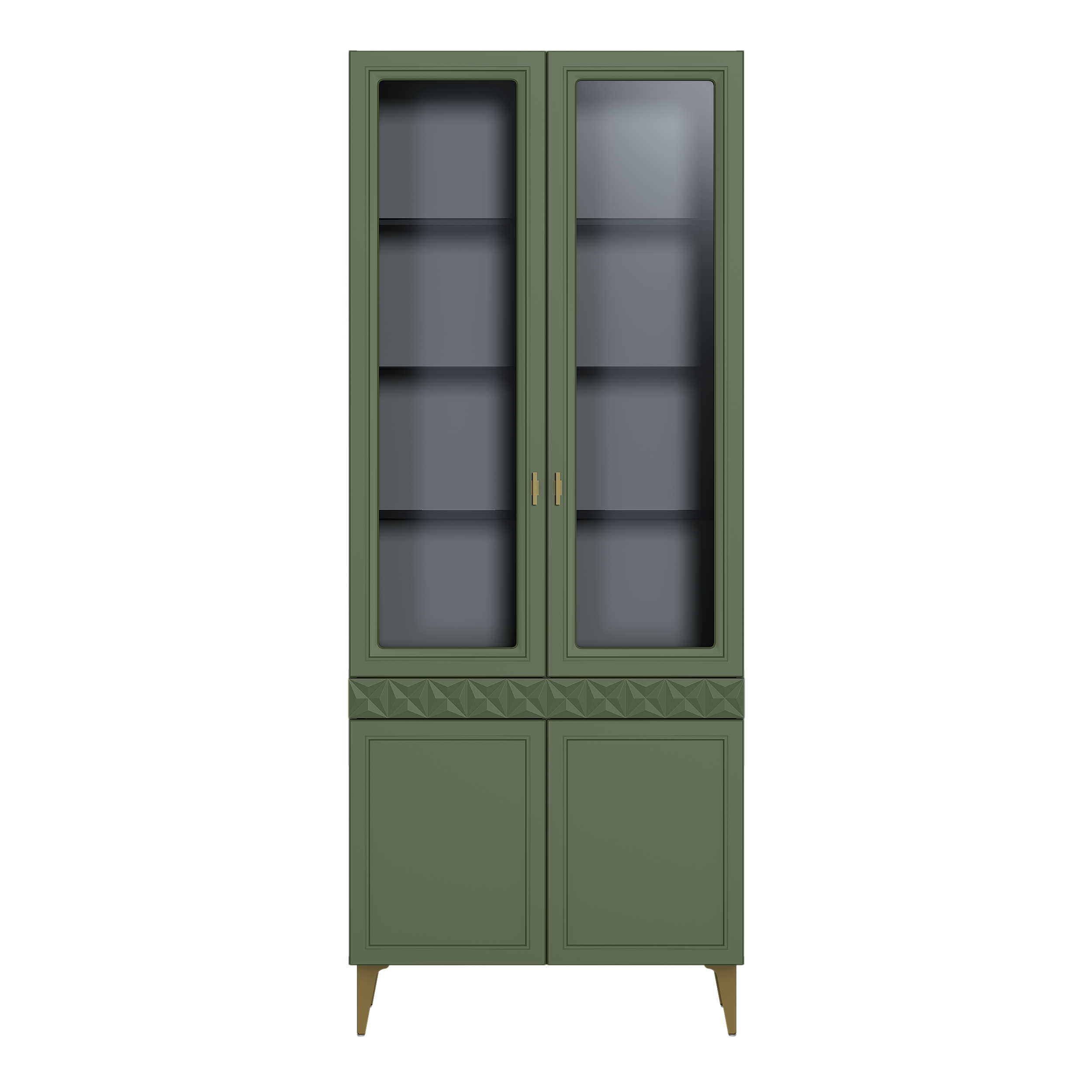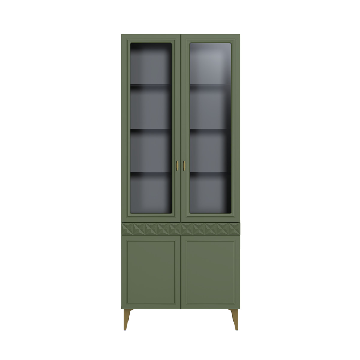 Изящные линии, глубокая фрезеровка фасадов из МДФ и благородные оттенки. Утончённая «Слоновая кость» и изысканная «Олива Шагрень» с глубоким зелёным тоном — создают атмосферу уюта, тепла и благородства. Металлические ручки и опоры золотого цвета придают мебели утончённый блеск, а петли и направляющие с доводчиками обеспечивают плавное и бесшумное закрытие фасадов.