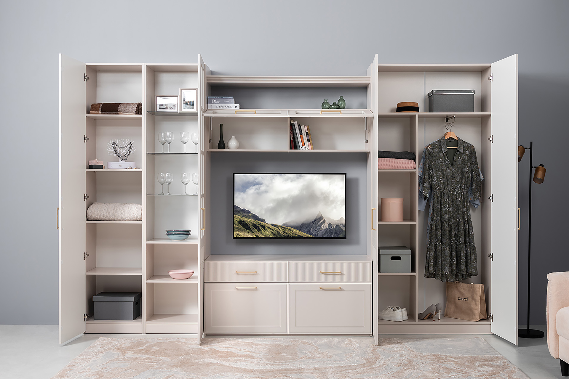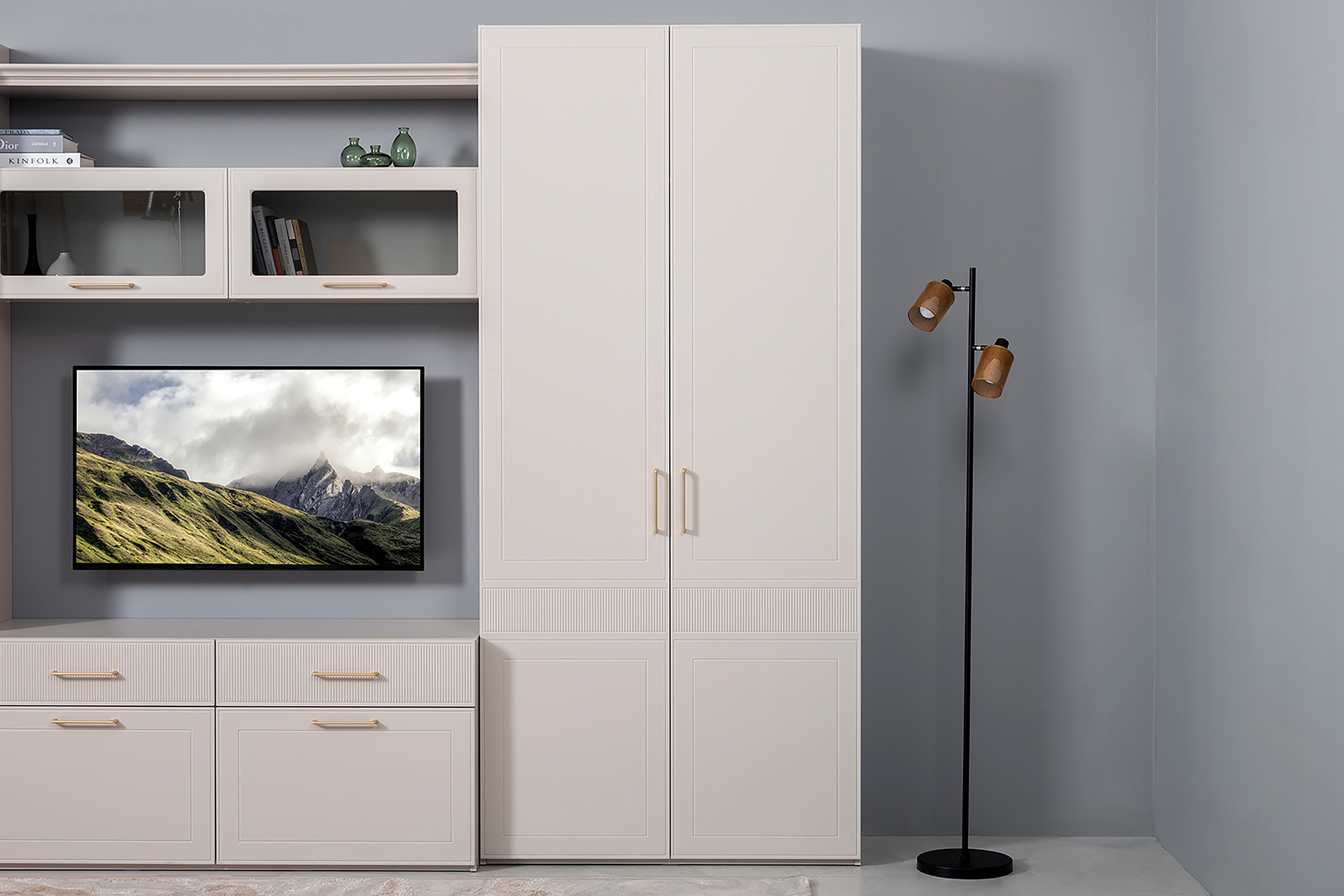 Гостиная Ричфорд композиция 1 с карнизами, кашемир 5981 BS, моно керамика D166-2 ПВХ, белый PE шагрень (собирается на любую сторону)