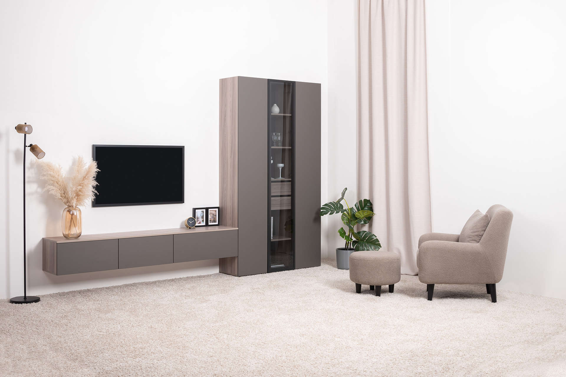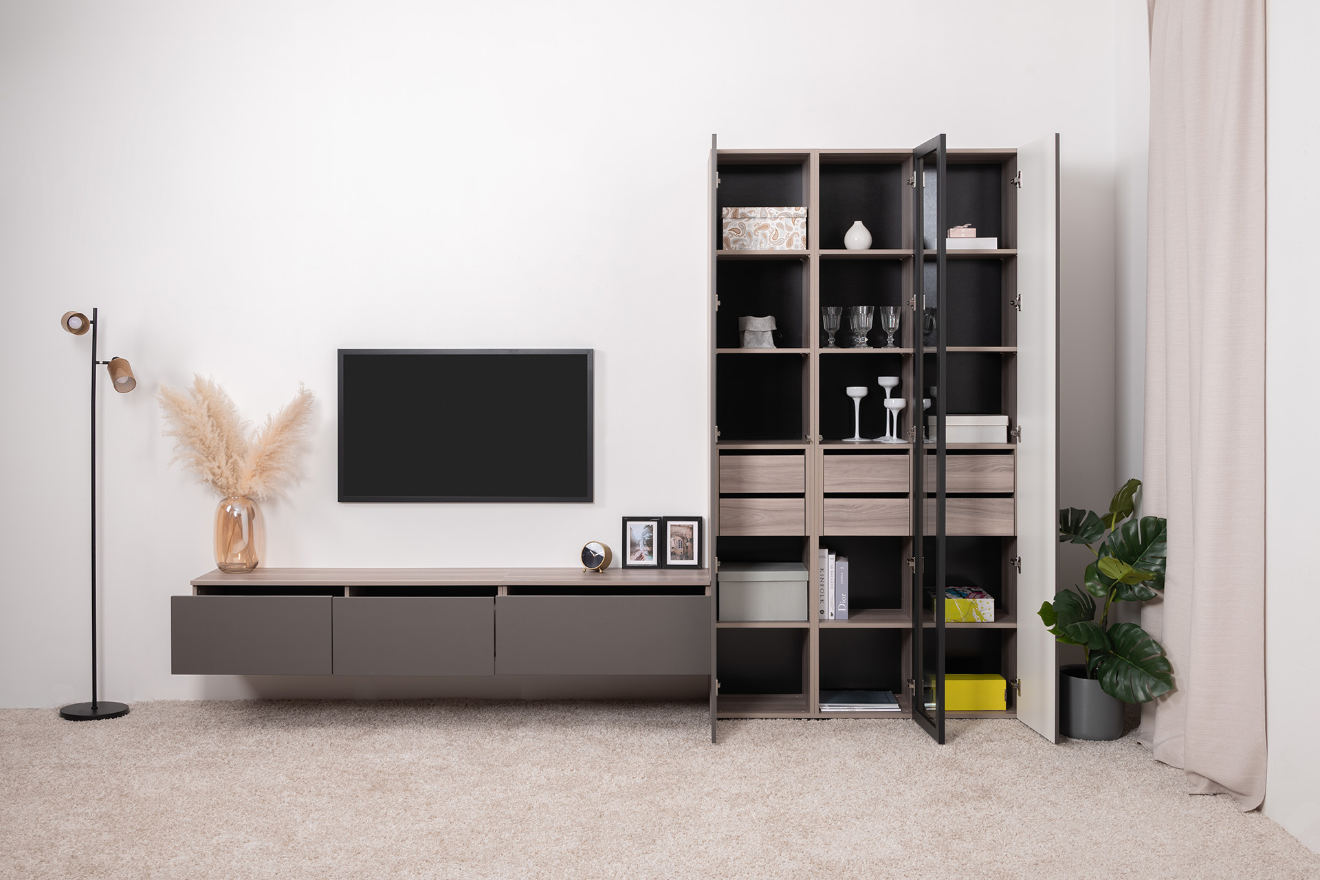 Разнообразие модулей и возможность их напольной и настенной установки позволит создать гостиную оптимальной конфигурации. Распашные фасады с механизмом push-to-open, направляющие скрытого монтажа в ящиках, петли с доводчиками, регулируемые опоры, крепеж в комплекте – комфорт продуман до мелочей.