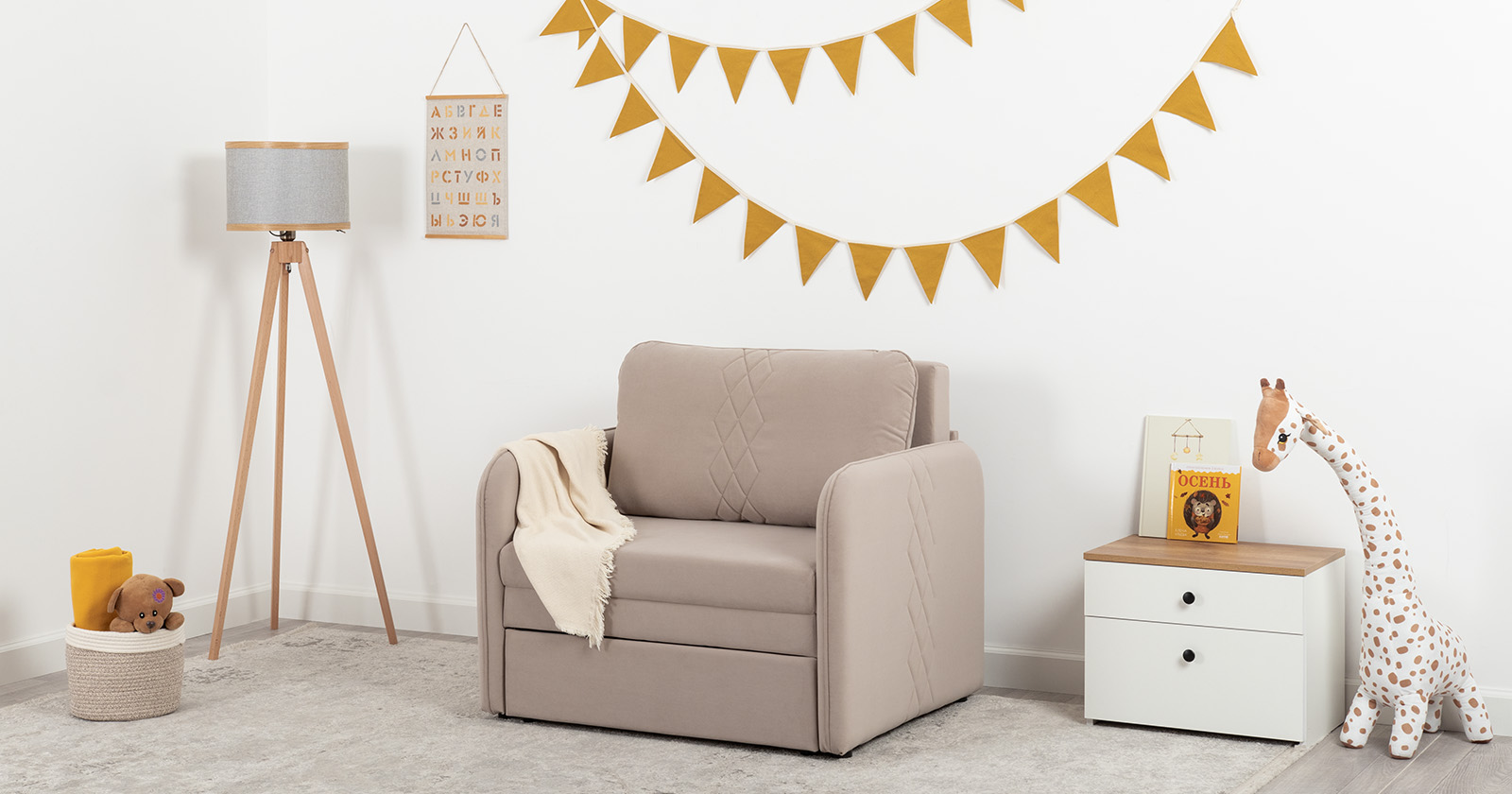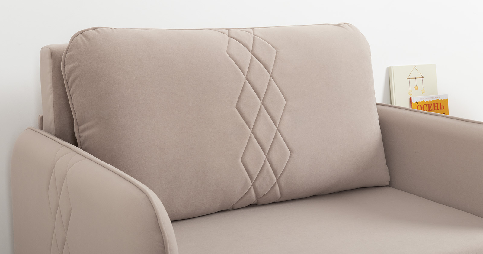 Стильный компактный диван для детской и гостиной. При своих скромных размерах он трансформируется в полноценное спальное место для детей и подростков. Лаконичный дизайн в виде декоративной стежки подчеркивает фактуру велюра, а небольшие размеры позволят разместить его в любом пространстве.