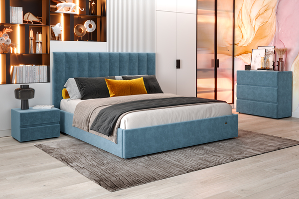 Подъемный механизм легок в управлении, а вместительный короб внутри кровати подойдет для хранения подушек, белья и других вещей. Мягкие тканевые ручки облегчают процесс подъема основания. Купить кровать можно удобным способом: оформить заказ в интернет- магазине, положив товар в корзину. С кроватями можно приобрести комод и тумбу «Ester». Ткань обивки возможно выбрать в цвет с кроватью, из представленных вариантов велюра.
