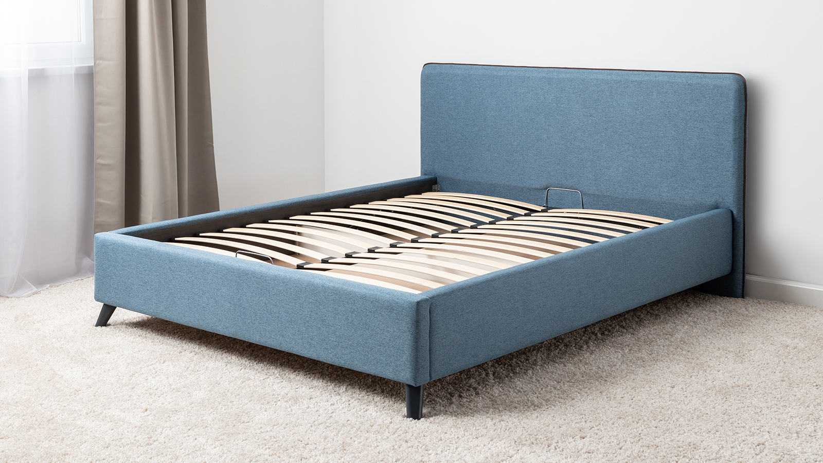 Основание кровати укомплектовано матрасодержателями. Жесткое кроватное дно из МДФ 6 мм. Задняя стенка изголовья выполнена в тех. ткани (спанбонд).