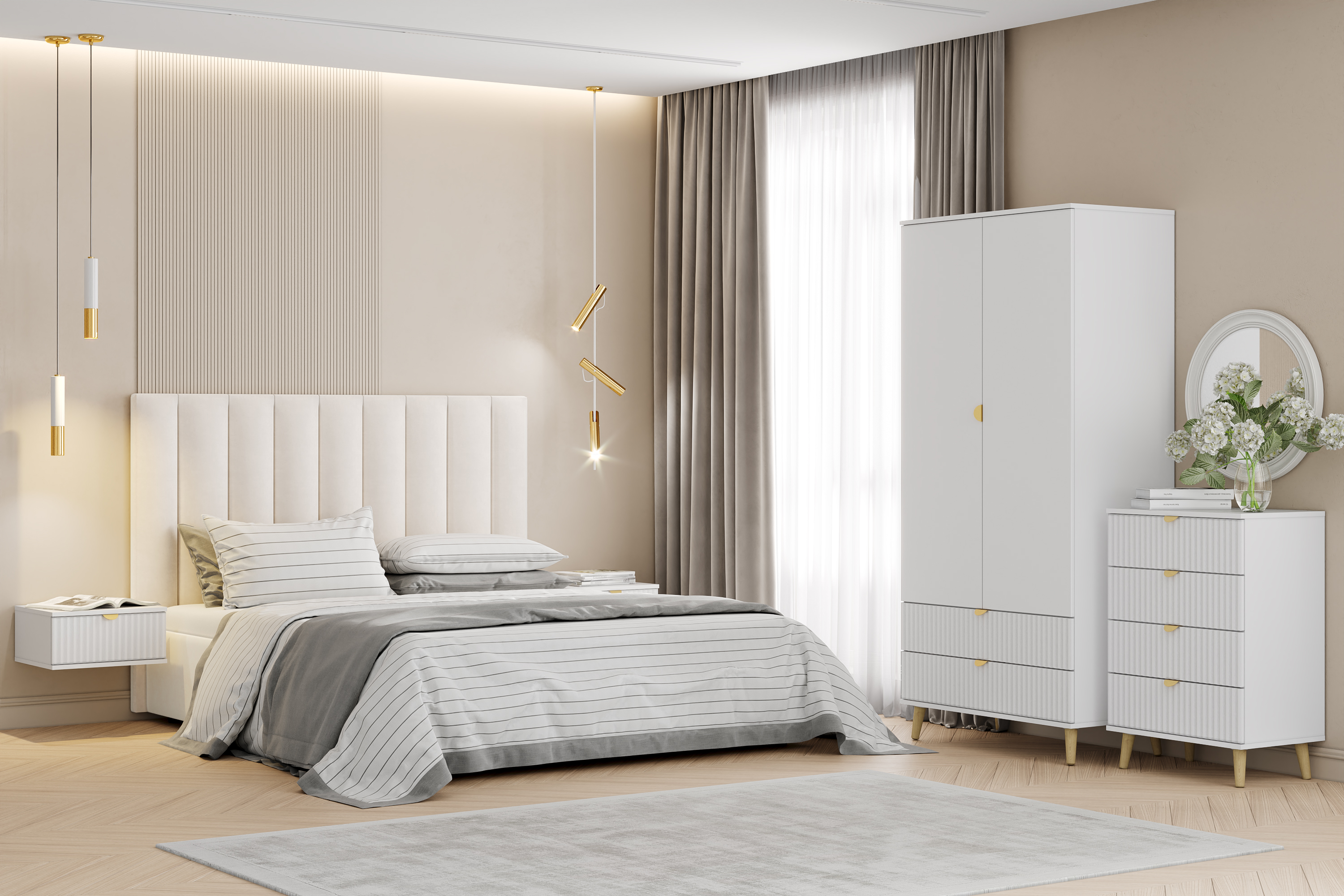 Шкаф оснащен двумя выдвижными ящиками, которые открываются плавно и бесшумно благодаря шариковым направляющим, полками, а также овальной штангой для организации предметов гардероба, а высокие опоры облегчают процесс уборки.