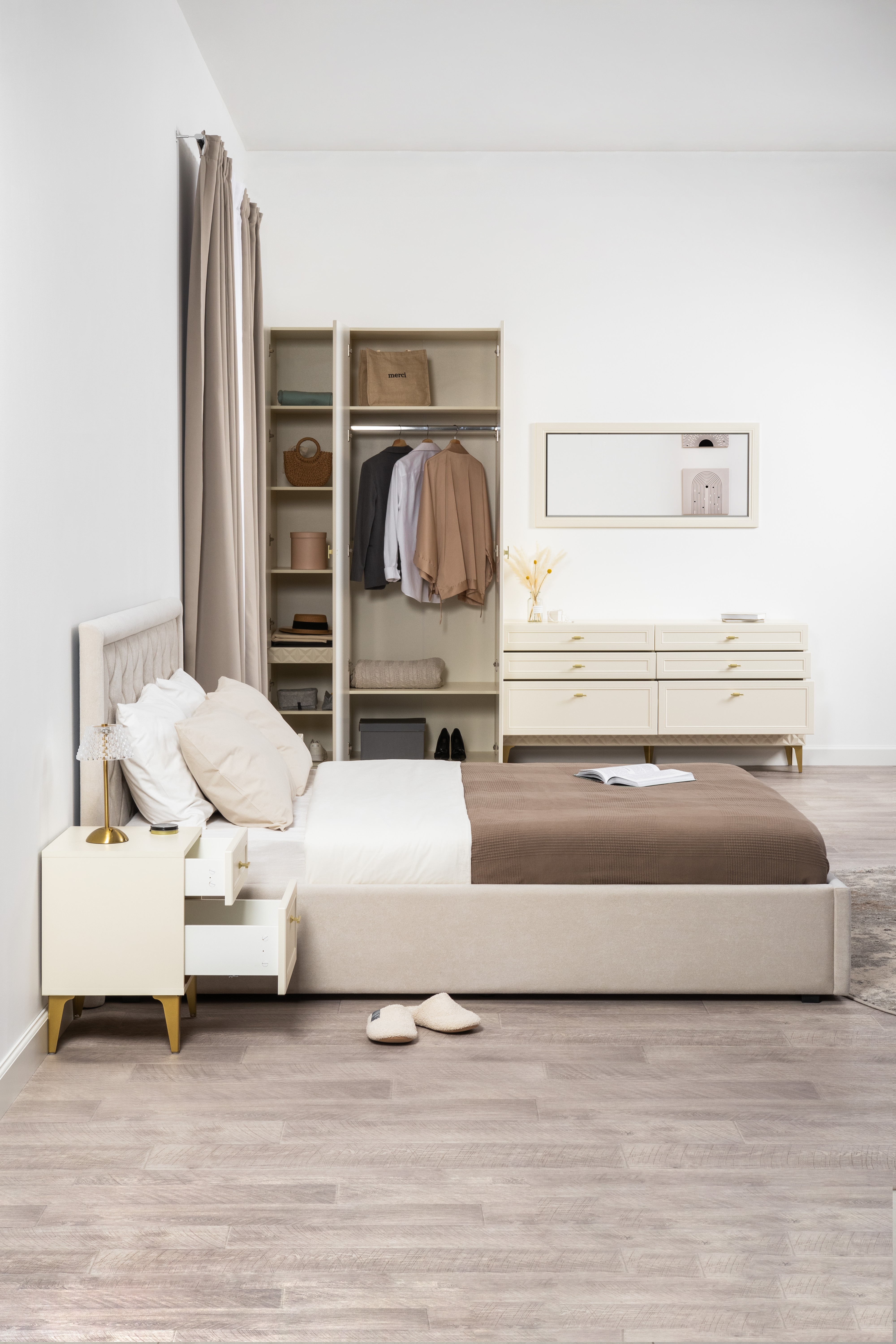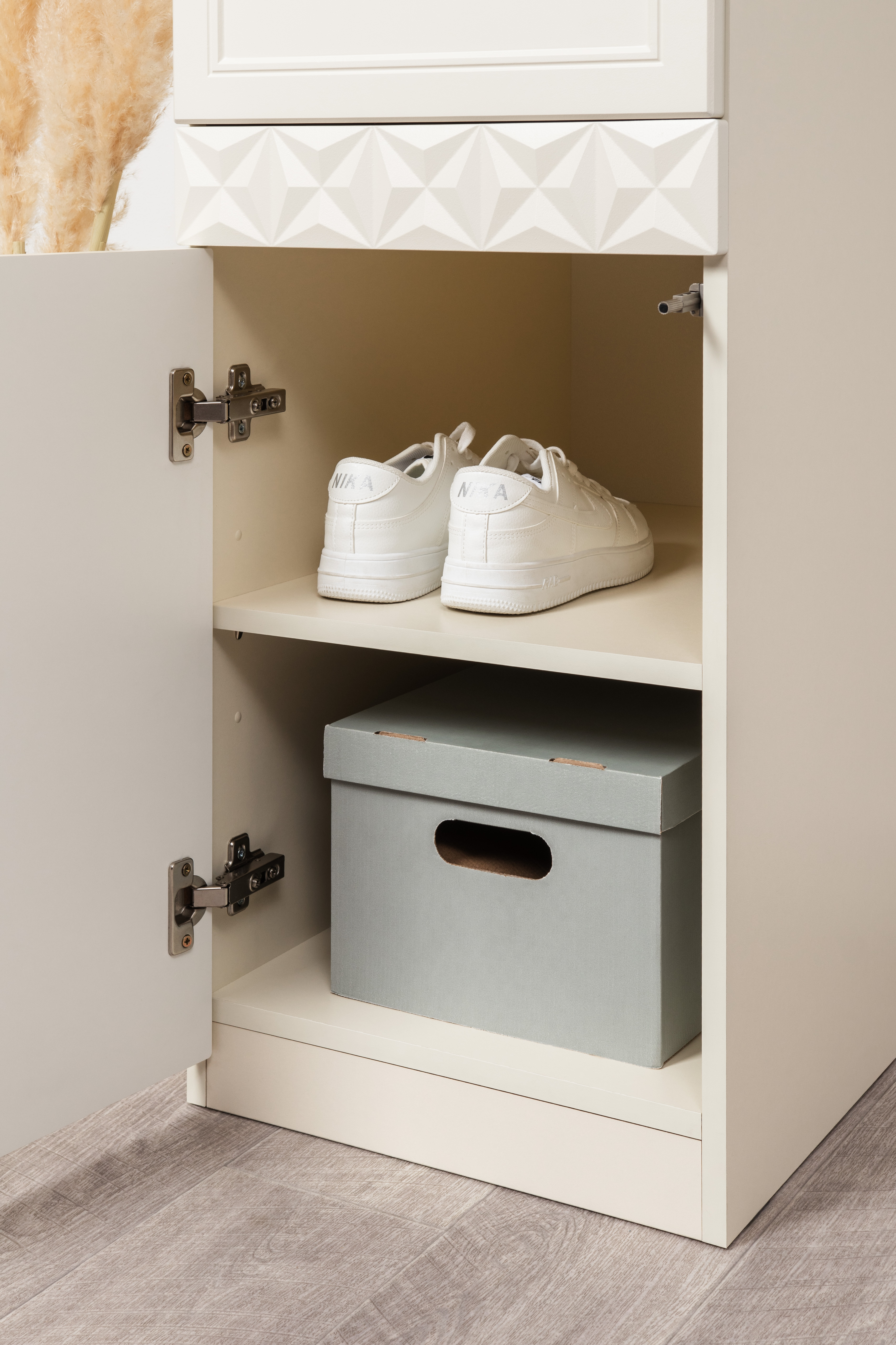 Изящные линии, глубокая фрезеровка фасадов из МДФ и благородные оттенки. Утончённая «Слоновая кость» и изысканная «Олива Шагрень» с глубоким зелёным тоном — создают атмосферу уюта, тепла и благородства. Металлические ручки и опоры золотого цвета придают мебели утончённый блеск, а петли и направляющие с доводчиками обеспечивают плавное и бесшумное закрытие фасадов.