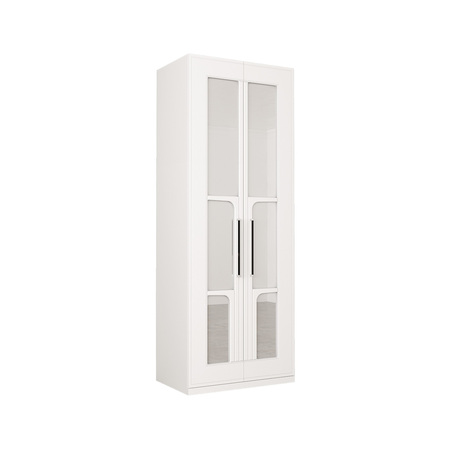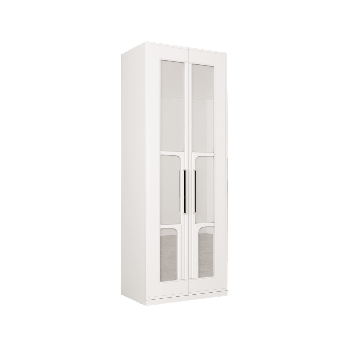 Нестандартно и интересно решён декор двустворчатого шкафа. Зеркало накладывается изнутри фасада, проявляя таким образом сквозную ажурную фрезеровку.