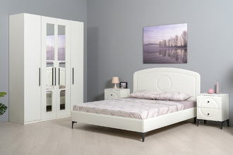 Кровать установлена на высокие ножки, что делает конструкцию лёгкой и воздушной, изголовье кровати декорировано пышным мягким элементом. Матрас укладывается на ортопедическое основание с гнутоклееными ламелями.