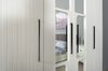 Фасады выполнены из МДФ с матовой ПВХ-плёнкой. Такое решение делает мебель визуально более "мягкой", комфортной и расслабляющей, что особенно актуально для спальни.
