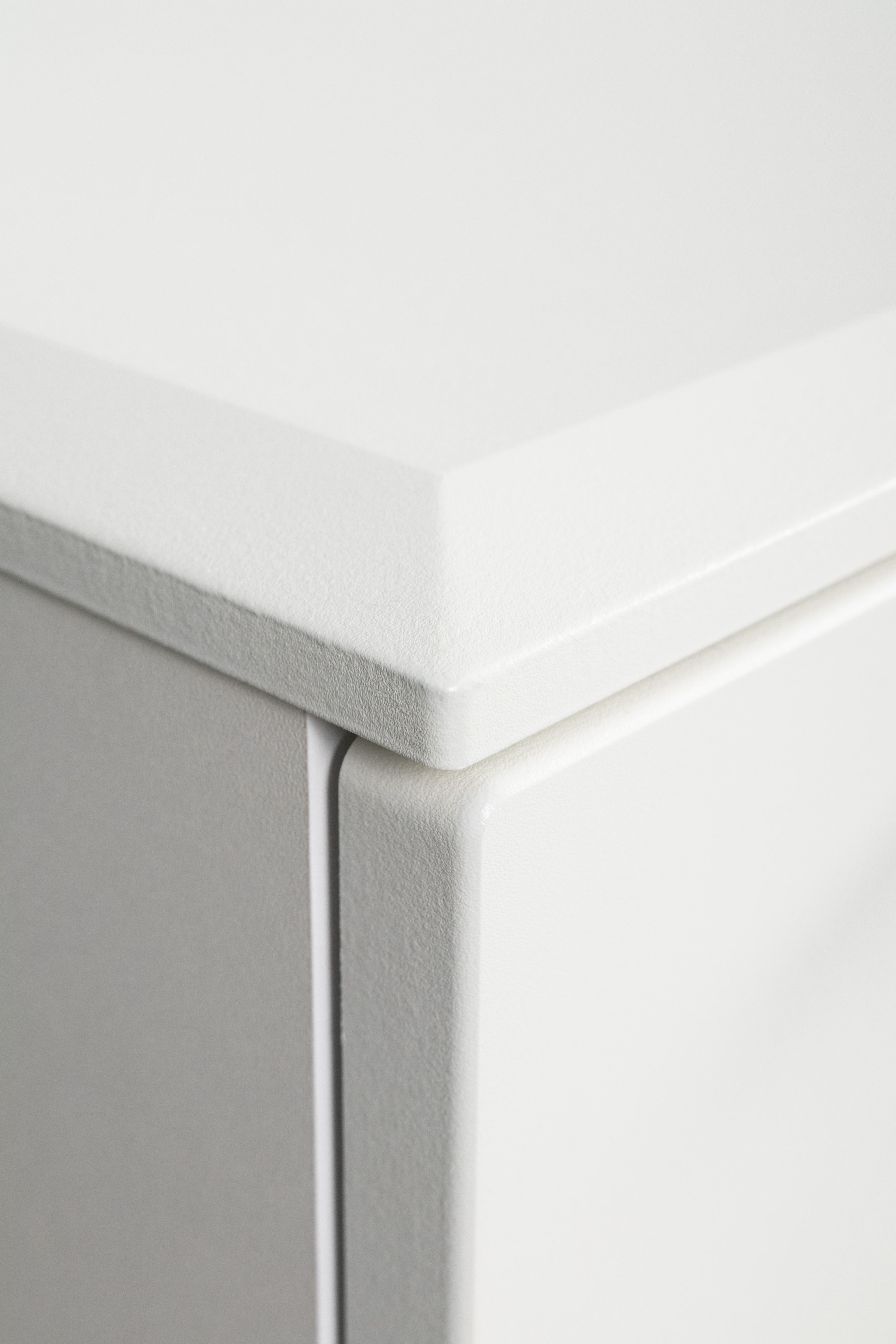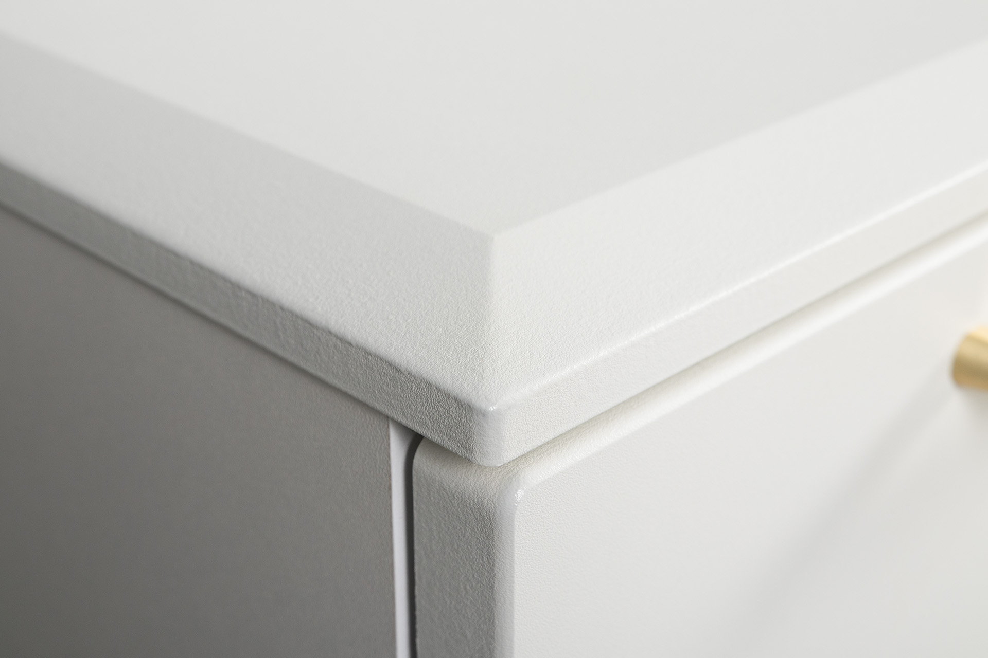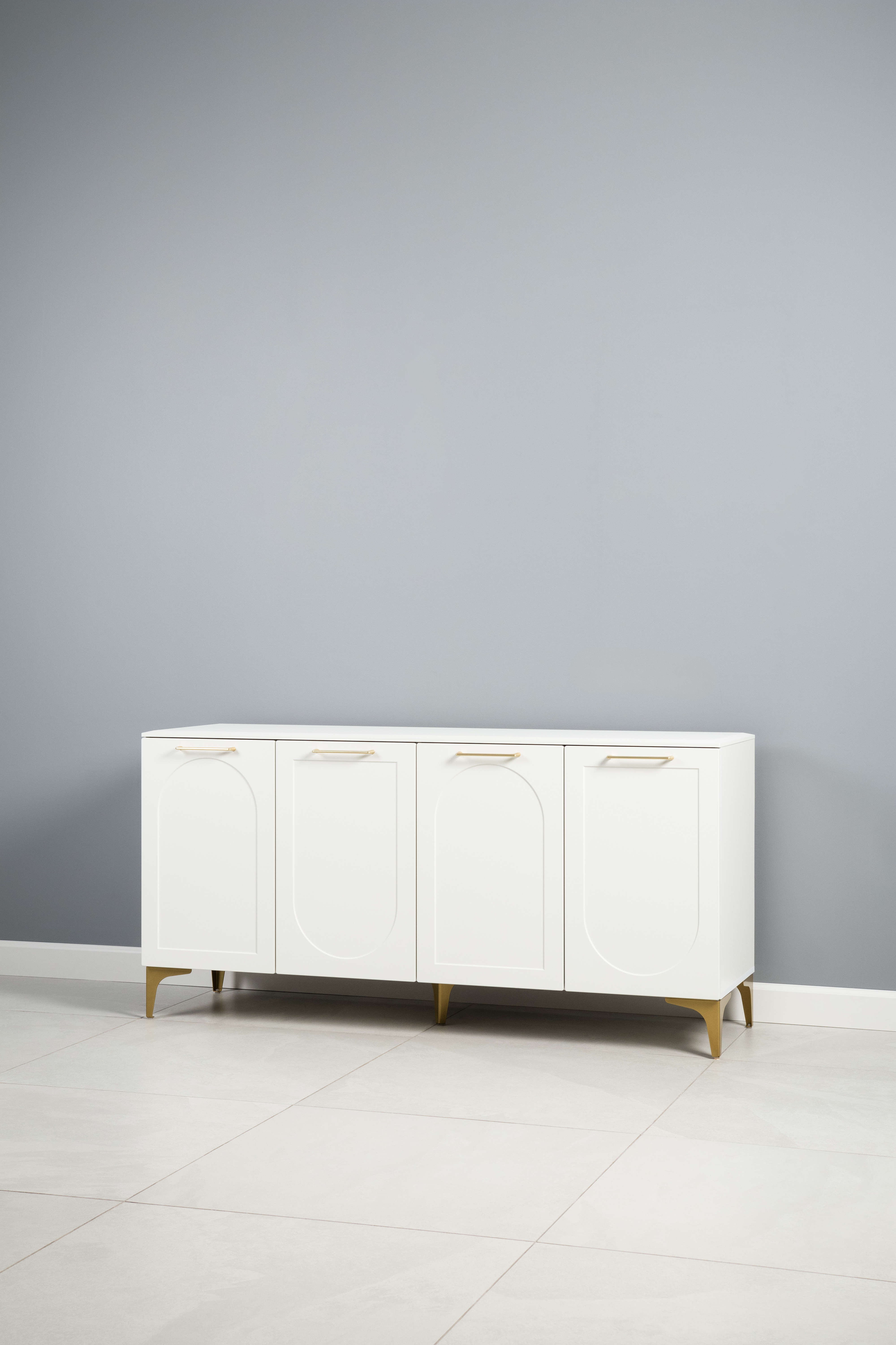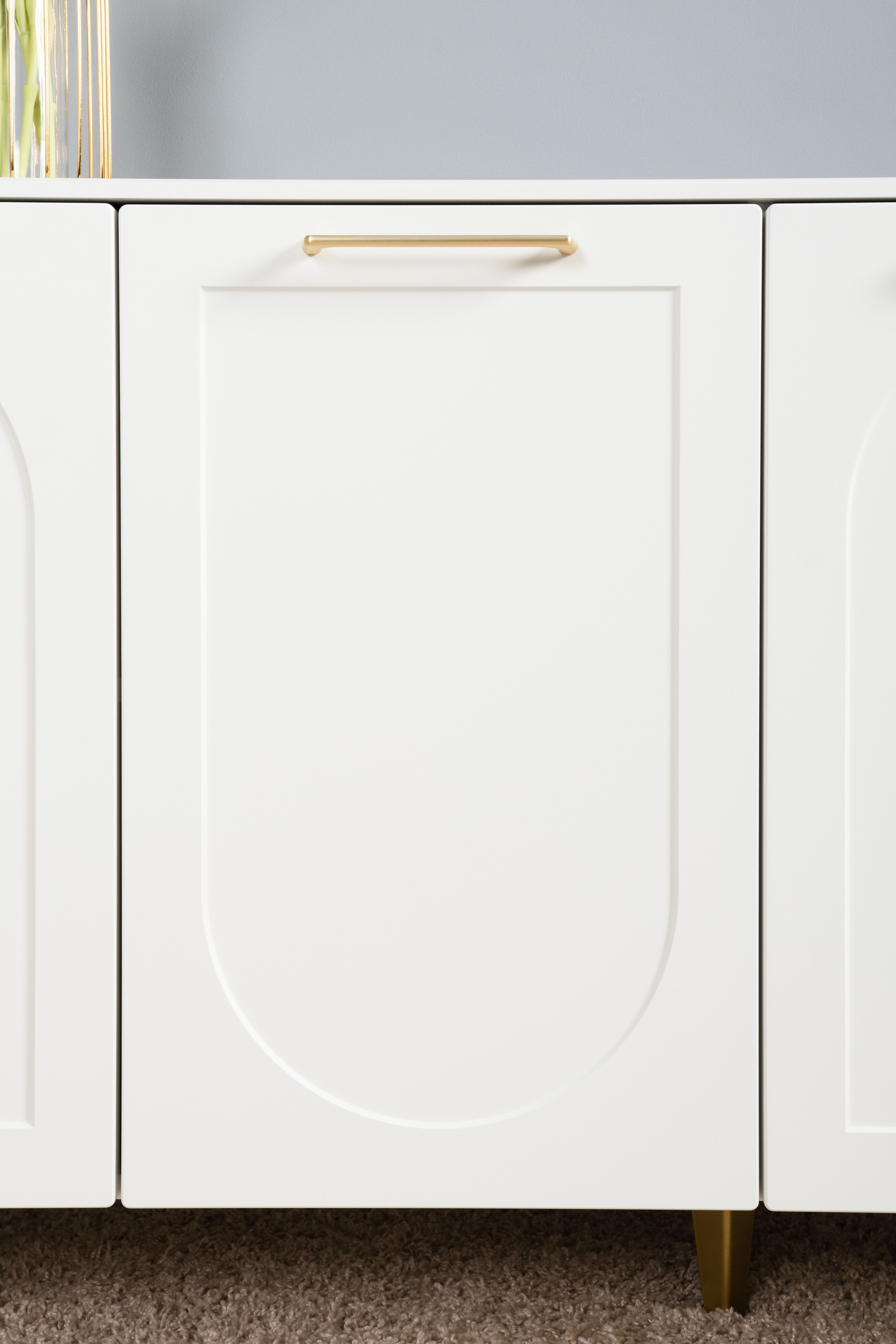 Фасады МДФ с фрезеровкой и верхняя крышка из МДФ сочетаются с металлическими ручками и опорами, создавая притягательный акцент в интерьере.