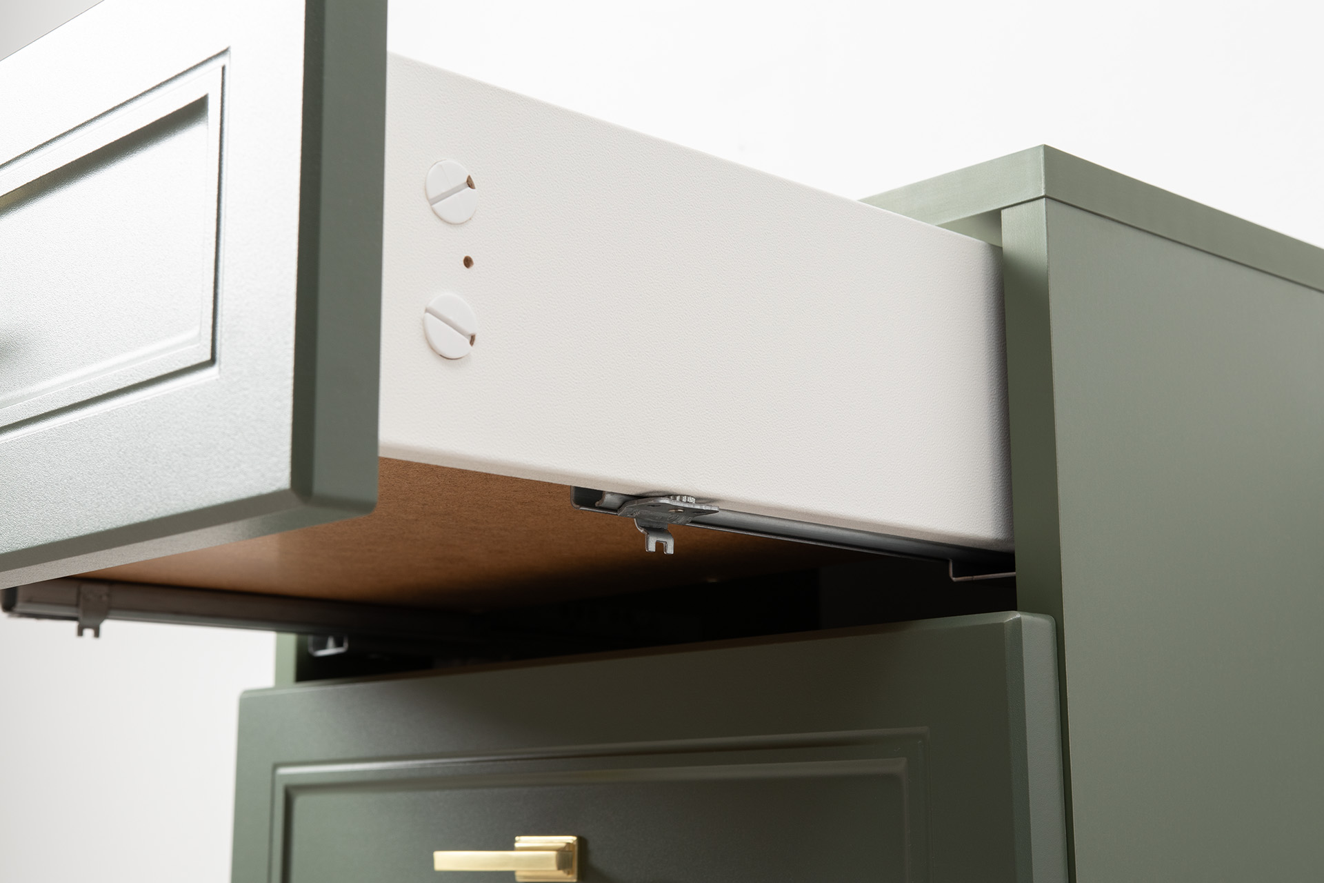 Изящные линии, глубокая фрезеровка фасадов из МДФ и благородные оттенки. Утончённая «Слоновая кость» и изысканная «Олива Шагрень» с глубоким зелёным тоном — создают атмосферу уюта, тепла и благородства. Металлические ручки и опоры золотого цвета придают мебели утончённый блеск, а петли и направляющие с доводчиками обеспечивают плавное и бесшумное закрытие фасадов.